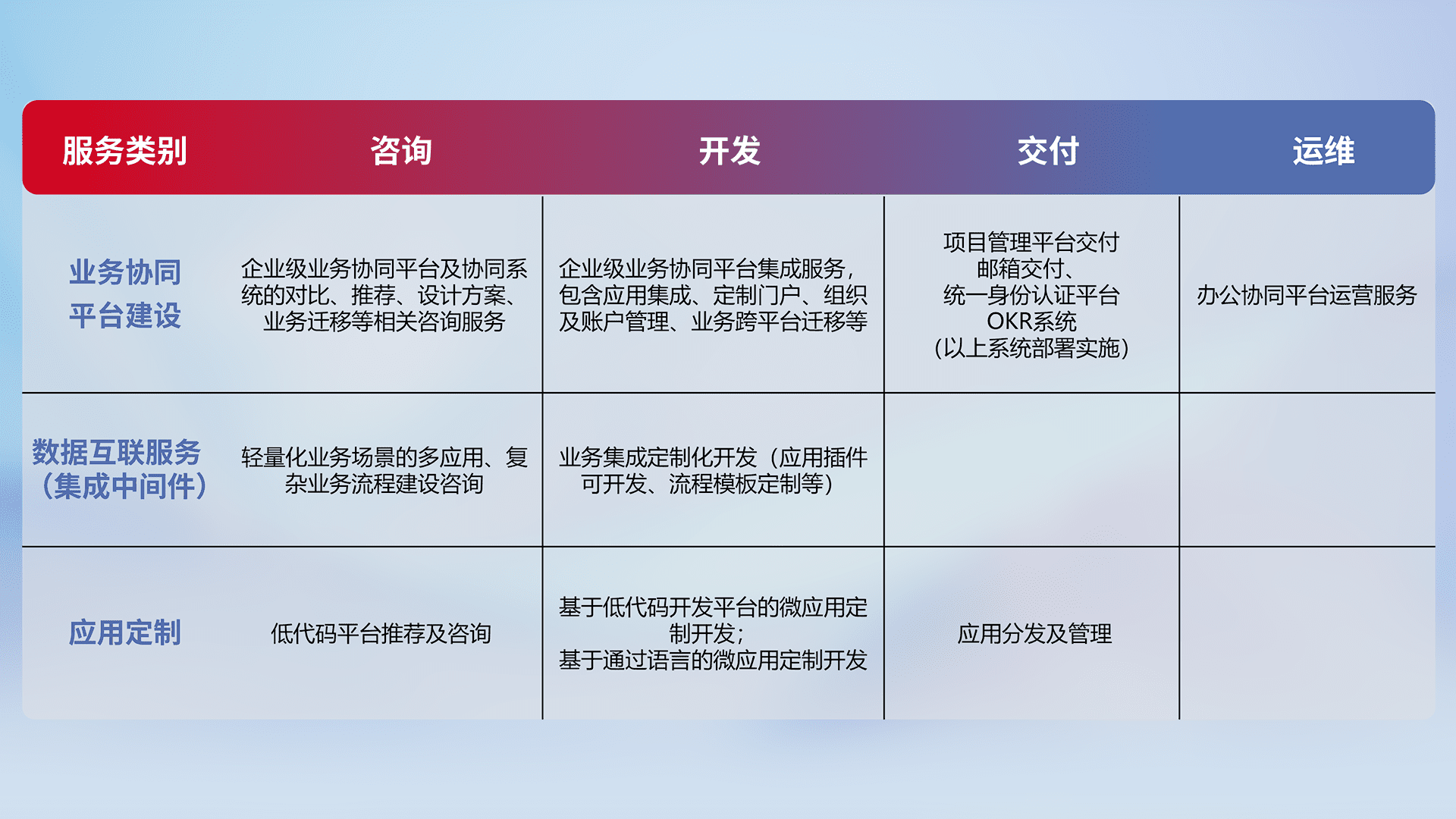 针对钉钉、、企微、、、IDaas等平台级产品提供产品的规划、、、、方案、、交付、、、、定制化开发等服务,,,实现如统一协同办公、、、、智能客户服务、、混合会议管理、、智能数据查询、、等业务场景,,,实现数字化转型。。。